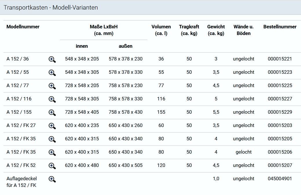 Transportkasten mit glatter Oberfläche Umlaufende, sehr stabile Randprofile am Behälterrand und Boden sorgen für eine dauerhafte BehälterformWände durch umlaufende trapezförmige Sicken verstärkt 2 ergonomische Schalengriffe Eckradius 30 mm Kästen stapelbar und teilweise auf Palettenmaße abgestimmt