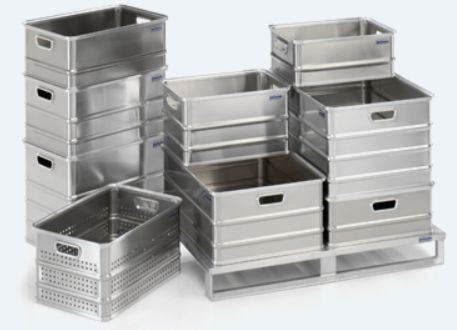 Transportkasten mit glatter Oberfläche aus Aluminium Umlaufende, sehr stabile Randprofile am Behälterrand und Boden sorgen für eine dauerhafte Behälterform Wände durch umlaufende trapezförmige Sicken verstärkt 2 ergonomische Schalengriffe Eckradius 30 mm Kästen stapelbar und teilweise auf Palettenmaße abgestimmt