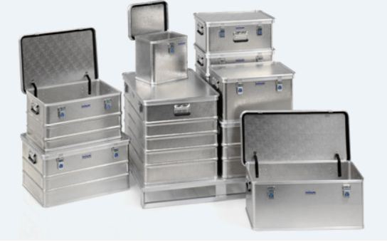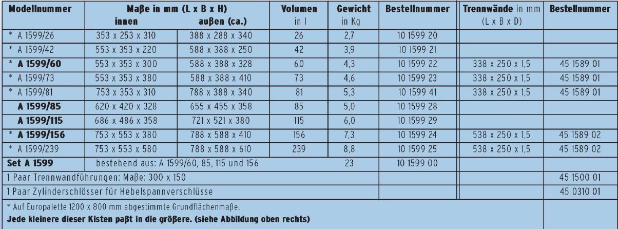Strukturierte, weitgehend kratzfeste Oberfläche Deckel und Behälter mit stabilen, vergüteten Pressprofilen an den Rändern Anscharnierter Deckel mit umlaufender Gummidichtung 2 Gurtbänder (Druckknopfsystem) Bei Bedarf kann der Deckel abgenommen werden. Eckenradius 30 mm 2 Federfallgriffe (Modell A 1599 / 26 nur 1 Federfallgriff am Deckel. Modell A 1599 / 42 zusätzlich 1 Federfallgriff an der Vorderwand.) Am oberen Behälterrand sind die Kistenmaße wegen der Profilverstärkung in Länge und Breite um ca. 10 mm verringert.