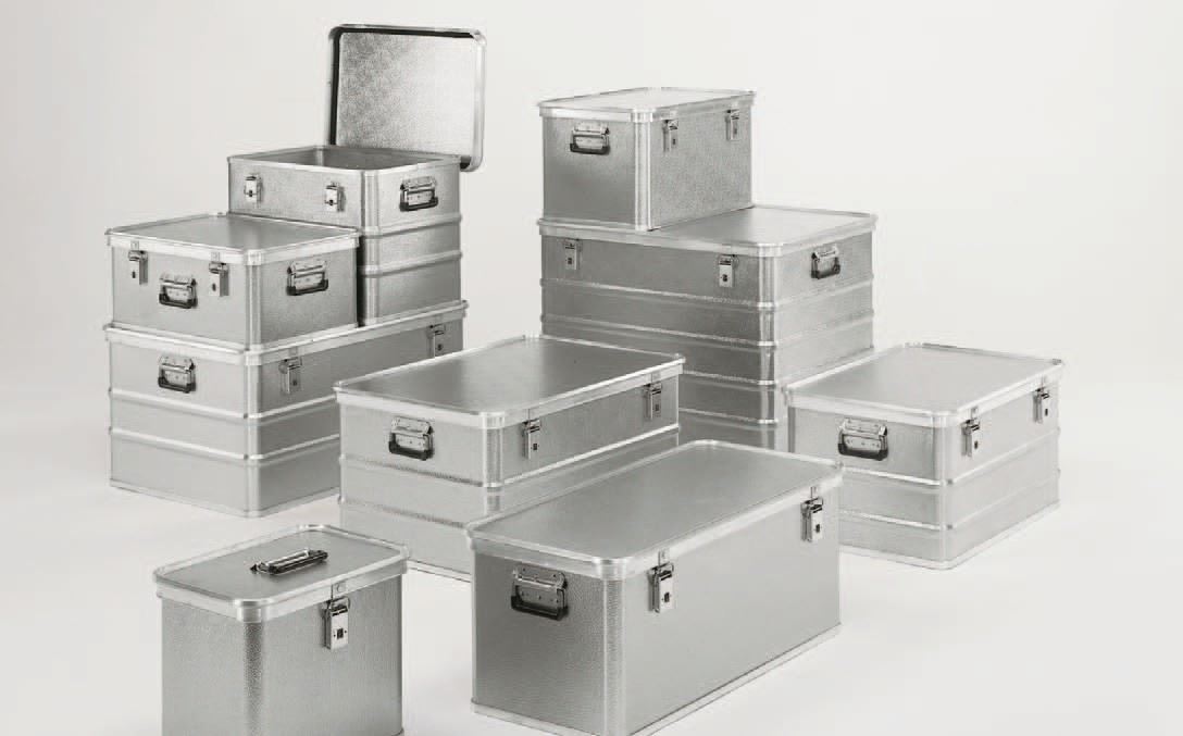 Ausstattung Strukturierte, weitgehend kratzfeste Oberfläche Deckel und Behälter mit stabilen, vergüteten Pressprofilen an den Rändern Anscharnierter Deckel mit umlaufender Gummidichtung 2 Gurtbände...