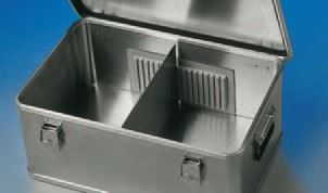 An den Längswänden der Kisten können selbstklebende Führungsschienen aus Kunststoff angebracht werden. Sie sind beliebig positionierbar und ergeben 16 Trennwandstellungen im Raster von 15mm. Trennwände aus Leichtmetall.