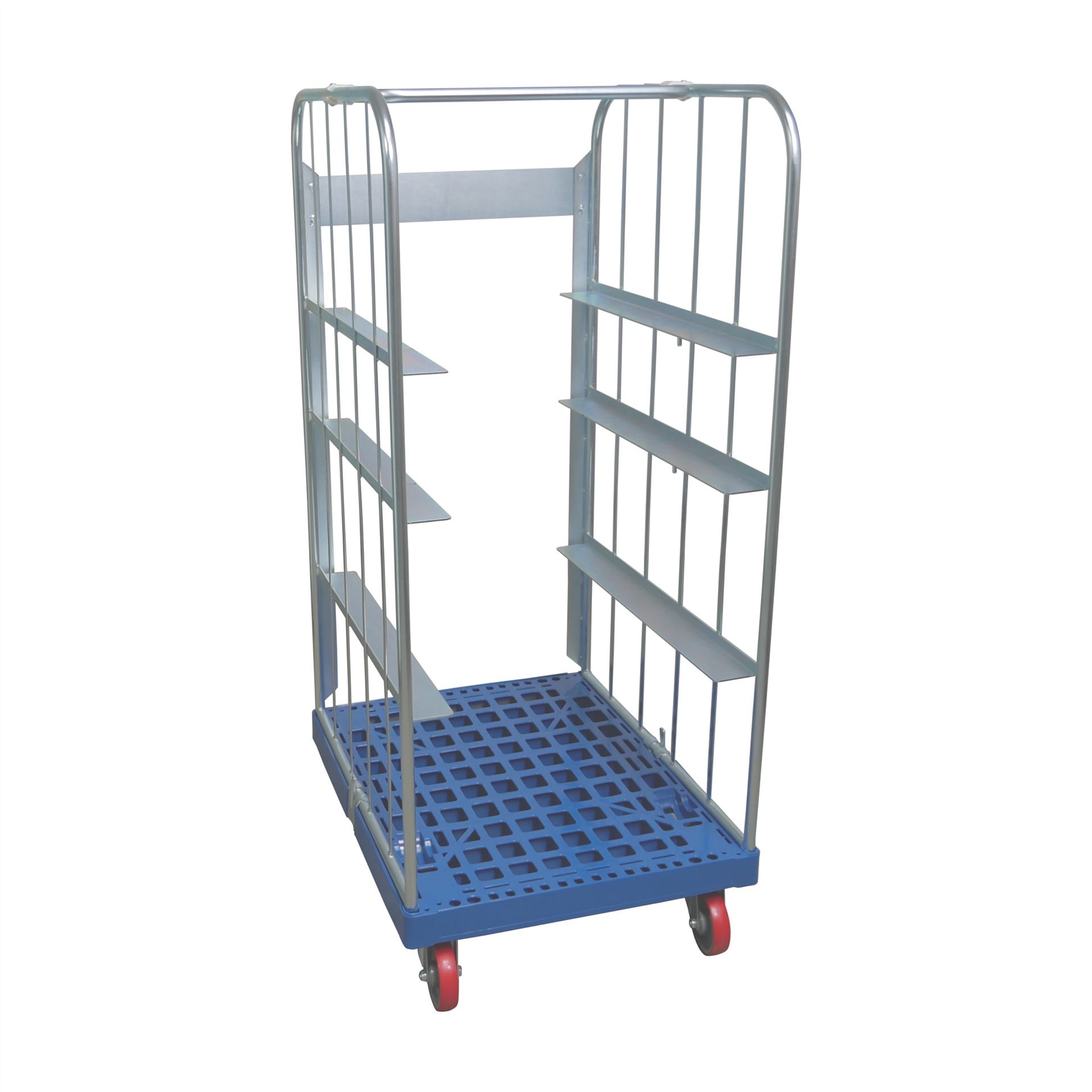 Kommissionierwagen mit Kunststoff-Rollplatte, für Euronorm-Boxen Außen: ca. 682 x 815 x 1560 mm (B/L/H), Innen: ca. 620 x 780 x 1320 mm (B/L/H)Tragkraft: 500 kg Kunststoff-Rollplatte aus HDPE in blau (RAL 5010) / rot (RAL 3000), Rollentyp 125 mm Polyurethan (PU) Rot, Felge PA, Kugellager, 2 Lenkrollen und 2 Bockrollen2 Seitengitter mit Rohrrahmen (22 x 1,8), 4 senkrechte Streben aus Flacheisen (15 x 3),3 Auflageschienen aus Flachstahl (3 mm) mit 10 mm Gefälle (vorne nach hinten)senkrechte Anstoßleiste hinten aus Flachstahl, rückseitige Verbindung der beiden Seitengitter aus Flachstahl (100 x 620), zusätzlicher u-förmiger Rohrbügel oben zwischen den Seitengittern(mit 2 KU-Schellen montiert), Oberfläche galvanisch blau verzinkt