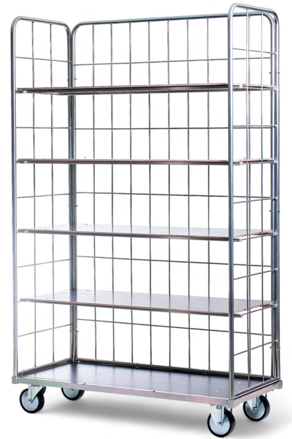 Grundausstattung: Palette,2 Bock + 2 Lenkrollen Polyamid 125 mm, 2 Seitengitter, Rückwand, ohne Zwischenböden (optional bestellbar)