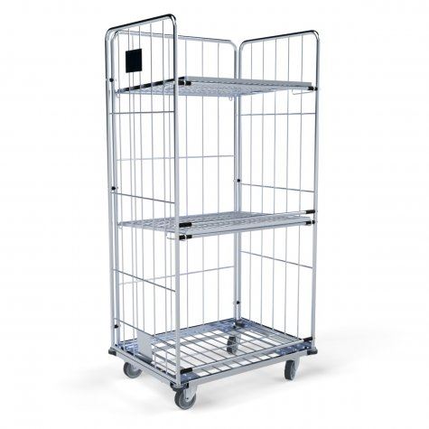 Wäscheregalwagen 850 x 630 mm Innenabmessung: 805 x 590 x 1600 mm 2 Lenk- und 2 Bockrollen Ø100 TPE, Kugellager Rohrdurchmesser Ø 20 mm Traglast: 500 kg/ Nutzhöhe: 1600 mm 1 Fahrrahmen, 2 Seitengitter, 1 Rückwand 4 Abweisräder + Beschriftungstafel + Trittblech Ausfachung: Rundeisen 5/6x senkrecht Ø 6 mm/ 4x waagerecht Ø 7,8mm 2 fest montierte Zwischenböden enthalten, die zur Vorderwand klappbar sind Oberfläche: galvanisch blau verzinkt