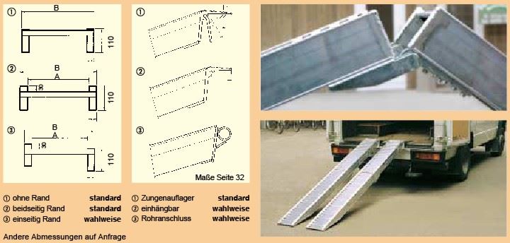 Diese Rampen sind für die Verladung von mittelschweren Fahrzeugen wie Baumaschinen, Gartengeräten oder Rasentraktoren, die mit Luftbereifung oder Gummiketten ausgerüstet sind, geeignet. Die Fahrfläche ist im unteren Teil der Anfahrfläche verstärkt, was die Lebensdauer der Schienen erheblich verlängert. Die Rampen können, je nach Wunsch, sowohl mit oder ohne, als auch nur mit einseitigem Rand geliefert werden. Sämtliche Verladeschienen sind auch in faltbarer Ausführung erhältlich.