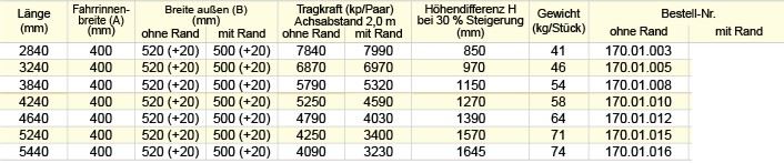 Andere Abmessungen auf Anfrage Diese Rampen sind für die Verladung von mittleren bis schweren Fahrzeugen wie Bagger, Traktoren oder Geländestapler, die mit Luftbereifung oder Gummiketten ausgerüstet sind, geeignet. Die Fahrfläche ist im unteren Teil der Anfahrfläche, verstärkt, was die Lebensdauer der Schienen erheblich verlängert. Die Rampen können, je nach Wunsch, sowohl mit oder ohne, als auch nur mit einseitigem Schutzrand geliefert werden. Sämtliche Verladeschienen sind auch in faltbarer Ausführung