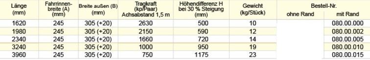 Andere Abmessungen auf Anfrage Diese Rampen sind für die Verladung von leichten bis mittelschweren Fahrzeugen wie Baumaschinen, Gartengeräten oder Rasentraktoren, die mit Luftbereifung oder Gummiketten ausgerüstet sind, geeignet. Die Fahrfläche ist im unteren Teil der Anfahrfläche verstärkt, was die Lebensdauer der Schienen erheblich verlängert. Die Rampen können, je nach Wunsch, sowohl mit oder ohne, als auch nur mit einseitigem Rand geliefert werden. Sämtliche Verladeschienen sind auch in faltbarer Ausführung erhältlich.