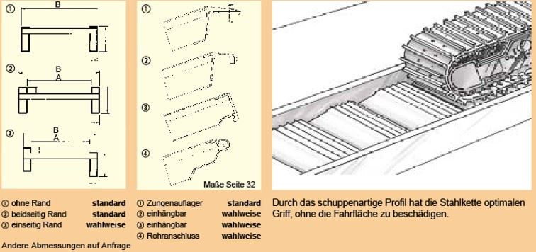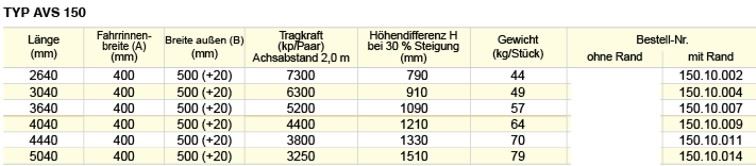 TYP AVS 150 für Stahl-Kettenfahrzeuge bis 8500 kp/Paar mit RAND Diese Verladeschienen wurden speziell entwickelt um schwere Baumaschinen mit Stahlketten, Stapler und Arbeitsbühnen zu verladen. Die ...