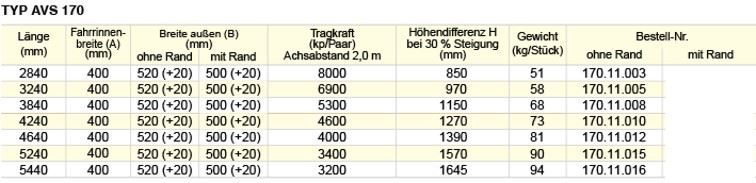 TYP AVS 170 für Stahlkettenfahrzeuge bis 8500 kp/Paar ohne RAND Andere Abmessungen auf Anfrage Diese Verladeschienen wurden speziell entwickelt um schwere Baumaschinen mit Stahlketten, Stapler und ...
