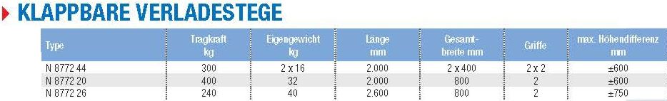Auch Fahrer, die keine hydraulische Ladebordwand am Fahrzeug besitzen, müssen bei der Auslieferung auf Verladehilfen nicht verzichten, denn die mobilen und klappbaren Verladestege mit Querrillenprofil sind die perfekten Fahrzeugbegleiter. Der Type N 8 772 26 ist serienmäßig mit zwei Vollgummirädern und zwei handfreundlichen Kunststoffgriffen ausgestattet. Auch für den Type N 8 772 20 empfehlen wir die optionalen Räder Zusatz Type 1067 zum ergonomischen Transportieren der Verladehilfen.