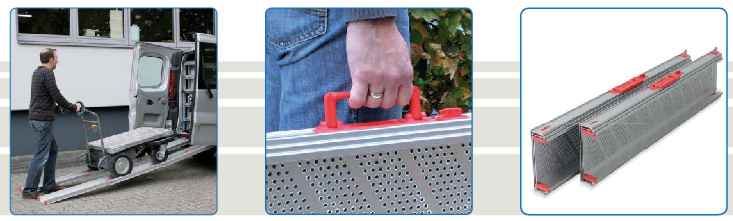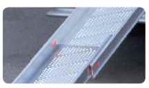 Alu-Verladeschienen, ausziehbar 2- oder 3 teilig, mit Laufflächenperforierung, Gumierung der Auflagefläche, Sicherungsstifte zum verriegeln der Verladehilfe, Kunststoffgriffe zum transportieren,