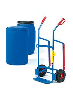Fasskarre 250 kg für Kunststoff-Fässer Fasskarren für Kunststoff-Fässer 120 220 Liter Inhalt, Stahlrohr geschweißt, pulverbeschichtet, blau RAL 5007, dauerhaft oberflächengeschützt. Räder wahlweise mit Vollgummi- oder Luftbereifung, Naben mit Rollenlager. Spanngurt zur Fass-Sicherung.