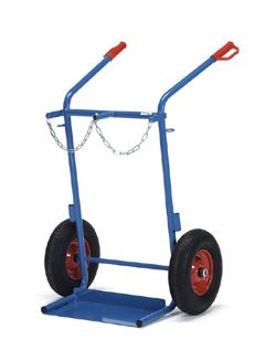 Stahlflaschenkarre 150 kg, 2 Stahlflaschen à 40-50 Ltr. Stahlrohr geschweißt, pulverbeschichtet blau RAL 5007. Für 2 Stahlflaschen à 40-50 Ltr. Inhalt, Ø 204-229 mm. Flaschenhalterungen mit Kettensicherung. Schweißdrahtköcher an beiden Holmen. Räder Vollgummi bzw. Luftbereifung, Naben mit Rollenlager.