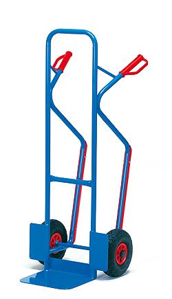 Handliche Stahlrohrkarren mit Stahlblechschaufeln, stabile Schweißkonstruktion, pulverbeschichtet, nur blau, RAL 5007. Sicherheitsgriffe, Räder wahlweise mit Vollgummi- oder Luftbereifung, auf Kunststoff- Felgen, Naben mit Rollenlagerung. Mit auswechselbaren Kunststoffgleitkufen. Zerlegte Anlieferung.