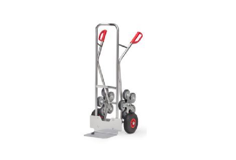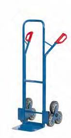 Stahlrohr-Treppenkarren mit Stahlblechschaufeln, stabile Schweißkonstruktion, pulverbeschichtet, nur blau RAL 5007. Sicherheitsgriffe. Mit 2 dreiarmigen Rad-Sternen, jeweils 3 Vollgummi-Räder 160 m...