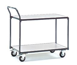 Elektrisch leitfähige Ausführung (ESD = Electric Static Discharge). Stahlrohr und Profilstahl geschweißt, elektrisch leitfähig pulverbeschichtet, dunkelgrau. Schraub- und Steckkonstruktion. Böden aus elektrisch leitfähiger Holzwerkstoffplatte nach DIN 68765, hellgrau. Tragkraft obere und mittlere Ladefläche 80 kg. Böden mit 5 mm hohem Rand. 2 Lenk- und 2 Bockrollen, Vollgummi-Bereifung, Naben mit Rollenlager, elektrisch leitfähig. Feststeller an den Lenkrollen, gemäß der Europäischen Norm EN1757-3 (Sicherheit von Plattformwagen).
