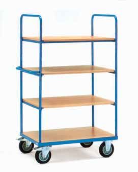 Bereifung TPE-Rollen 160 x 40 bzw. 200 x 50 mm, Naben mit Rollenlager. Feststeller an den Lenkrollen, gemäß der Europäischen Norm EN 1757-3 (Sicherheit von Plattformwagen).