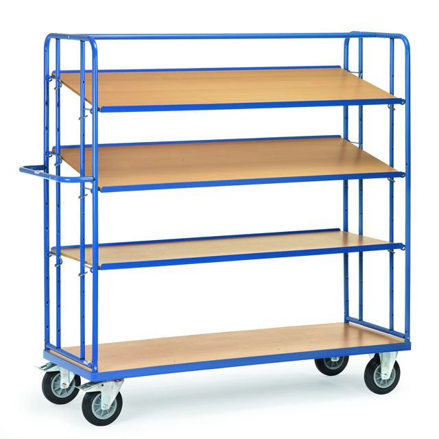 Etagenwagen mit 3 losen Böden, H 1800 mm Stahlrohr-/Profilstahl-Konstruktion, pulverbeschichtet RAL 5007. 1 fester und 1 loser Boden aus Holzwerkstoffplatte, Oberfläche Buchendekor, eingelegt in Winkelstahl mit 15 mm hohem Rand an den Längsseiten. Loser Boden variabel einlegbar, Einhängeraster 120 mm. Mögliche Neigung bei schräger Einhängung ca. 15 und ca. 30 Grad. 2 Lenk- und 2 Bockrollen, , Naben mit Rollenlager. Feststeller an den Lenkrollen, gemäß EN 1757-3.