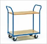 Tischwagen, Baukastensystem, Plattform und Schiebebügel verschraubbar, obere Böden einhängbar. Lieferung zerlegt, Profilstahl-/Stahlrohr-Schweißkonstruktion, pulverbeschichtet, nur blau RAL 5007. Böden Holzwerkstoffplatte, Oberfläche Buchendekor, 2 Lenk- und 2 Bockrollen, Vollgummibereifung, Naben mit Rollenlagerung. Feststeller an den Lenkrollen gemäß der Europäischen Norm EN 1757-3 (Sicherheit von Plattformwagen).