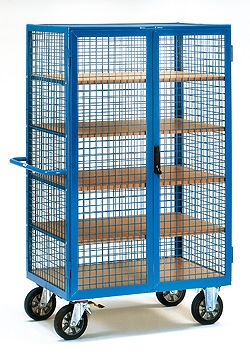 Kastenwagen 750 kg, mit Doppelflügeltür und Treibriegelverschluss Kastenwagen mit Doppel-Flügeltür aus Winkelstahl, pulverbeschichtet, mit eingeschweißtem Drahtgitter an der offenen Längsseite. Treibriegelverschluss mit Schwenkhebel und Zylinderschloss. 1 fester und 4 lose Böden aus Holzwerkstoffplatten, Oberfläche Buchendekor. 2 Lenk- und 2 Bockrollen, Bereifung TPE-Rollen, Naben mit Kugellager. Feststeller an den Lenkrollen, gemäß der Europäischen Norm EN 1757-3 (Sicherheit von Plattformwagen).