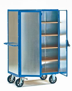 Kastenwagen in Winkelstahl-Konstruktion mit Rohrschiebegriff, pulverbeschichtet. Stirnwände, Längswand, Flügeltür und Dach mit verzinktem Stahlblech 1 mm stark verkleidet. Doppel-Flügeltür aus Winkelstahl mit Treibriegelverschluss, Schwenkhebel und eingebautem Zylinderschloss. 1 fester und 4 lose Böden. Böden aus Holzwerkstoffplatten, Oberfläche Buchendekor. 2 Lenk- und 2 Bockrollen, Bereifung TPE-Rollen, Naben mit Kugellager. Feststeller an den Lenkrollen, gemäß der Europäischen Norm EN 1757-3 (Sicherheit von Plattformwagen).