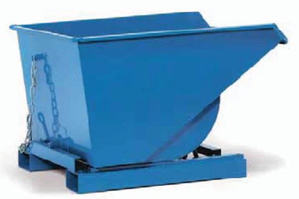 Selbstkipper für Schüttgüter zum selbsttätigen Abkippen auch extrem leichter Güter bei völliger Entleerung. Robuste Schweißkonstruktion aus 3-mm-Stahlblech, pulverbeschichtet blau RAL 5007. Serienmäßig mit Staplertaschen, Abrollsicherung und Kippverriegelung, Gliederkette als Abrutsch- und Kippsicherung.