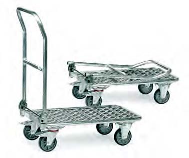Klappwagen Alu Alurohrwagen mit Aluplattform, Schiebebügel auf Plattform klappbar. 2 Lenk- und 2 Bockrollen, Vollgummi-Bereifung, Naben mit Rollenlager. Feststeller an den Lenkrollen, gemäß der Europäischen Norm EN 1757-3 (Sicherheit von Plattformwagen). Tragkraft obere Ladefläche 80 kg.