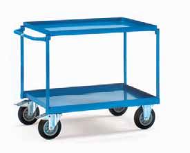 blau RAL 5007. 2 Lenk- und 2 Bockrollen, Vollgummi-Bereifung, Naben mit Rollenlager. Feststeller an den Lenkrollen, gemäß der Europäischen
