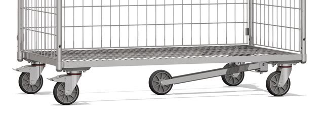 Zubehör für Kommissionierwagen 28500 und 28510: Ein fünftes TPE-Rad an einem federbeaufschlagten Profilstahlarm als Führungsrolle für guten Geradeauslauf. Drehen auf der Stelle bleibt trotzdem möglich.